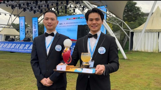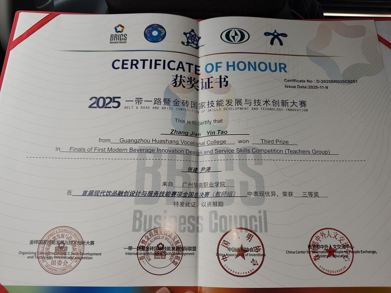 作为深耕产教融合的教学酒店,广州太阳城大酒店始终坚持创新构建“教师 + 技师”双岗育人机制,鼓励教师既要立足教学一线,夯实教学根基,又要深入行业前沿,积累实战经验,实现教学与实践的有机结合。此次获奖的两位教师均具备丰富的酒店实战经验与教学经验,其获奖作品更是融入了广州太阳城大酒店在饮品研发与服务创新方面的实践成果,真正实现了“将课堂带进赛场,将赛项反哺教学”的良性循环,为学院酒店管理与厨艺相关专业的教学改革与人才培养提供了生动范例。