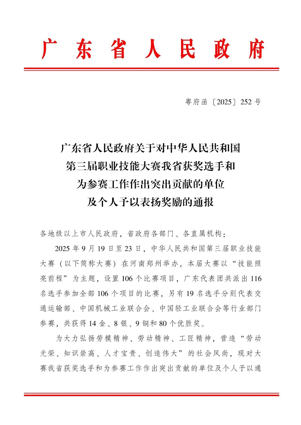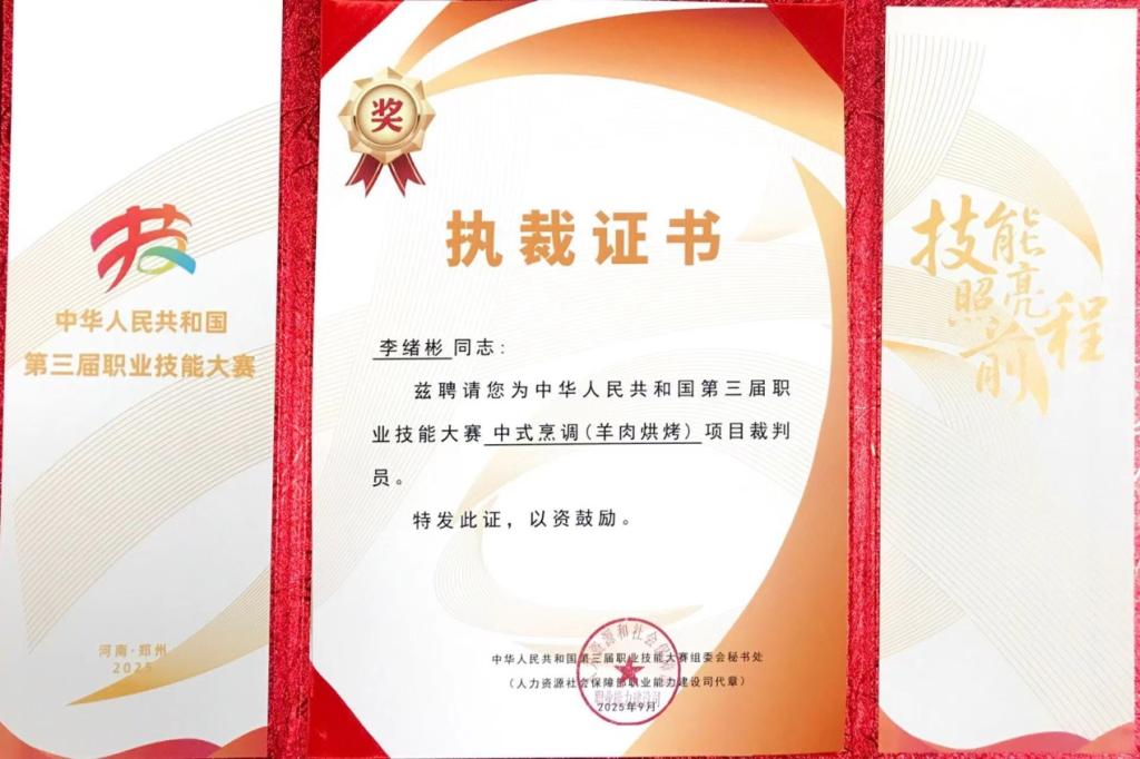 近日,在备受瞩目的中华人民共和国第三届职业技能大赛中,beat365中文唯一官网酒店管理与厨艺学院李绪彬老师凭借出色的专业能力与高度的责任感,在大赛裁判执裁与选手指导工作中表现卓越,获得广东省人民政府发文通报表扬并获人力资源社会保障部职业能力建设司颁发的执裁证书。