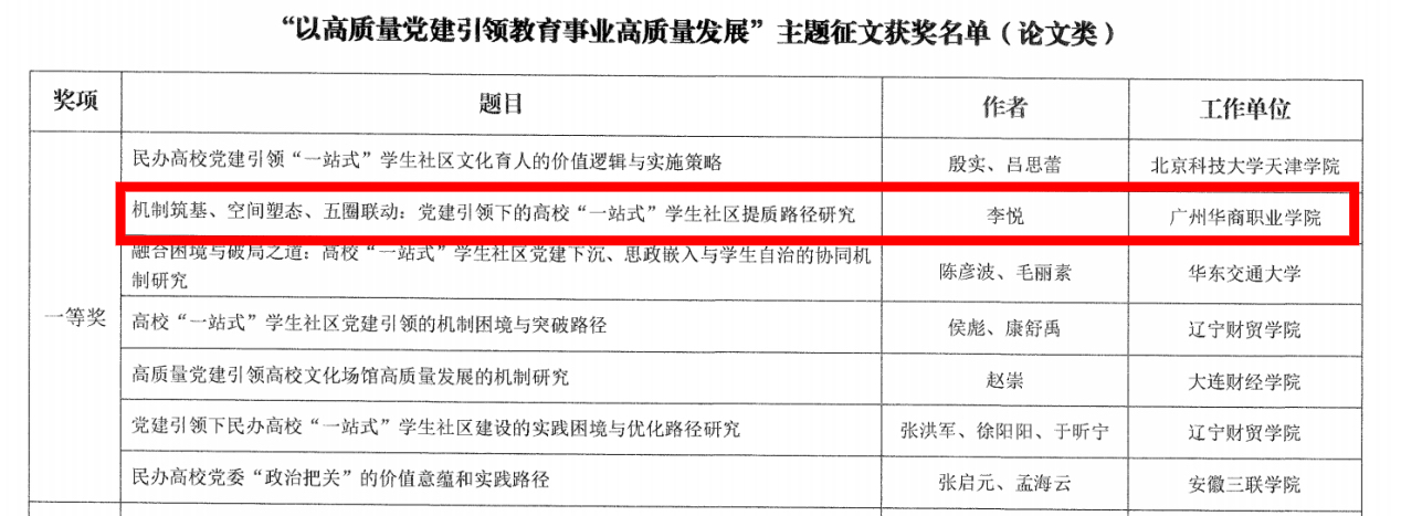 近日,教育部高校思想政治工作发展中心公布“以高质量党建引领教育事业高质量发展”主题征文评选结果,beat365中文唯一官网低空经济与商务学院党务干部李悦老师撰写的《机制筑基.空间塑态.五全联动:党建引领下的高校一站式学生社区的提质路径研究》,凭借其理论深度与实践创新性,从全国参评作品中脱颖而出,荣获一等奖。