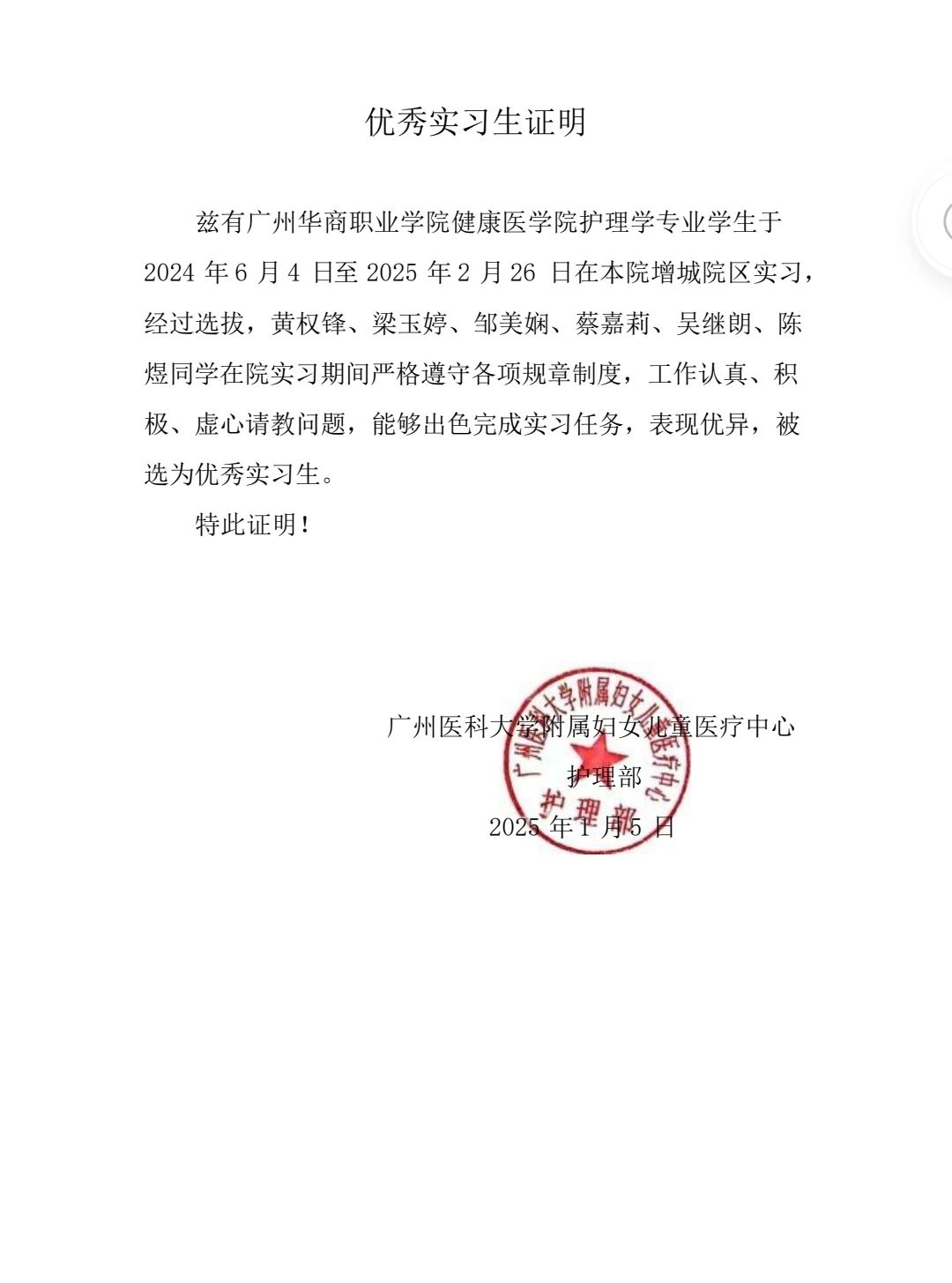 实习单位:广州医科大学附属妇女儿童医疗中心(增城院区)