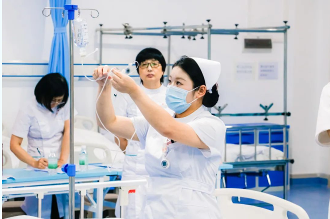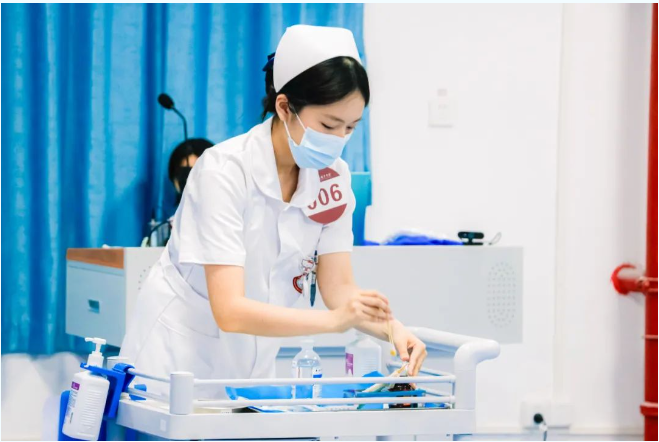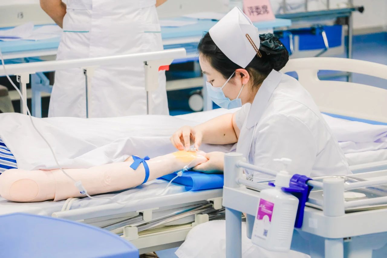 赛道二采用标准化病人情景模拟,选手们需要完成从病史询问到静脉输液的全过程。这一环节不仅考核无菌操作、穿刺技术等专业能力,同样注重评估与患者的沟通技巧和人文关怀。参赛选手以专业的操作和温暖的沟通,展现了现代护理人才的综合素质。