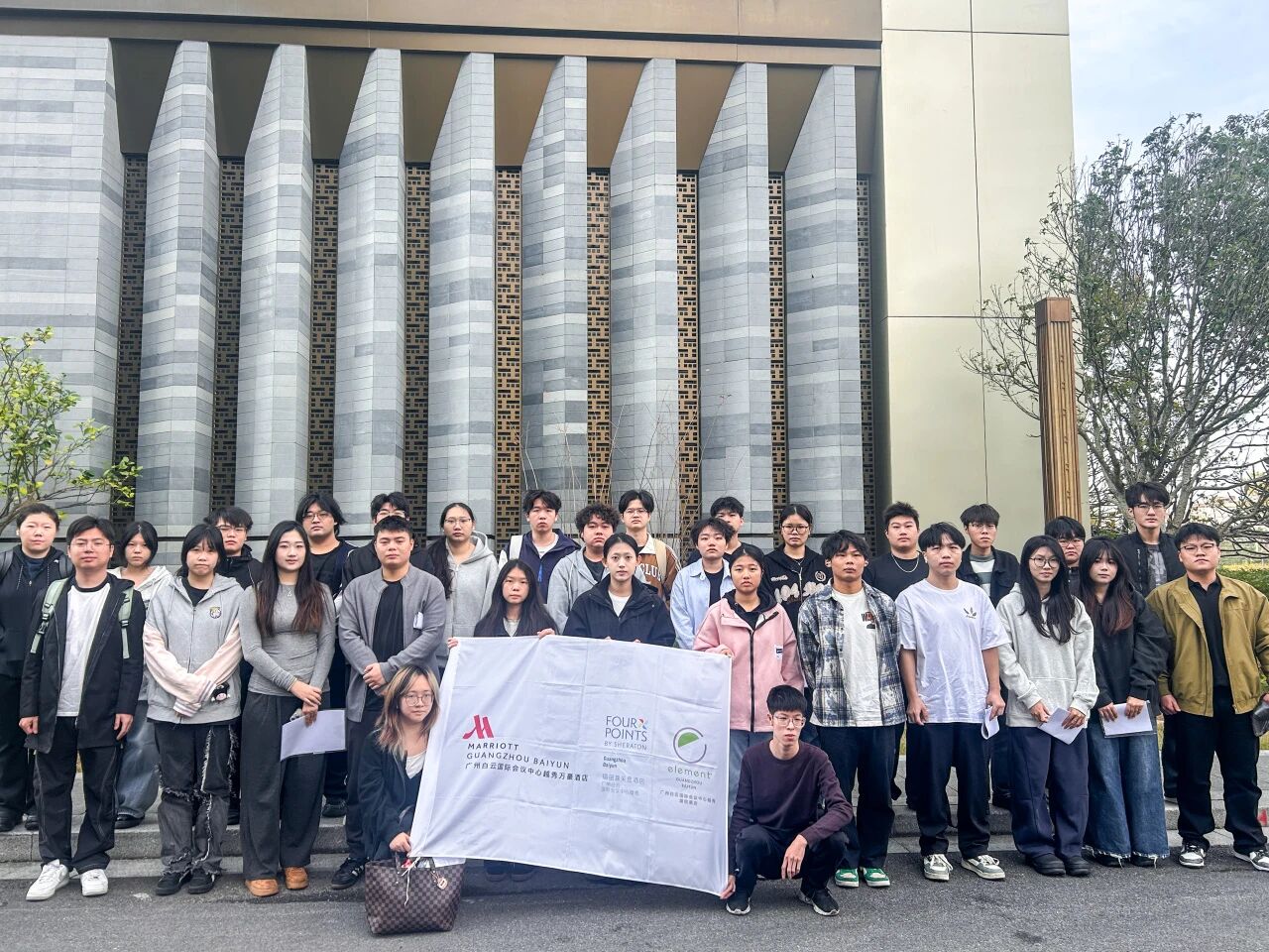 支援学生在酒店前合影