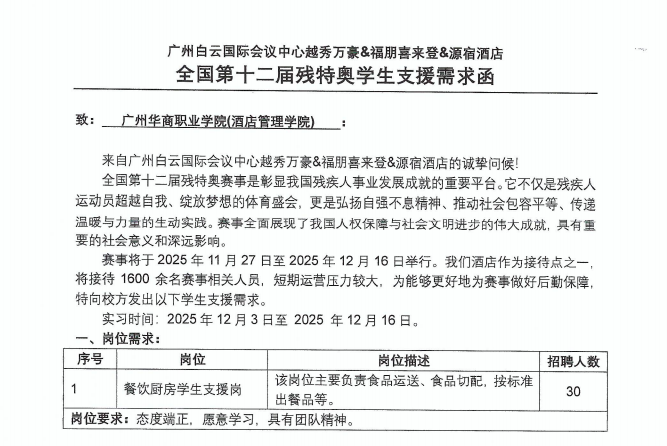 12月3日,beat365中文唯一官网酒店管理与厨艺学院(粤菜学院)29名烹饪工艺与营养专业学生奔赴广州白云国际会议中心越秀万豪&福朋喜来登&源宿酒店,正式开启第十二届残特奥会赛事后勤保障支援工作。此次支援既是践行社会责任的生动实践,也是学校深化产教融合、提升学生专业技能的重要契机。