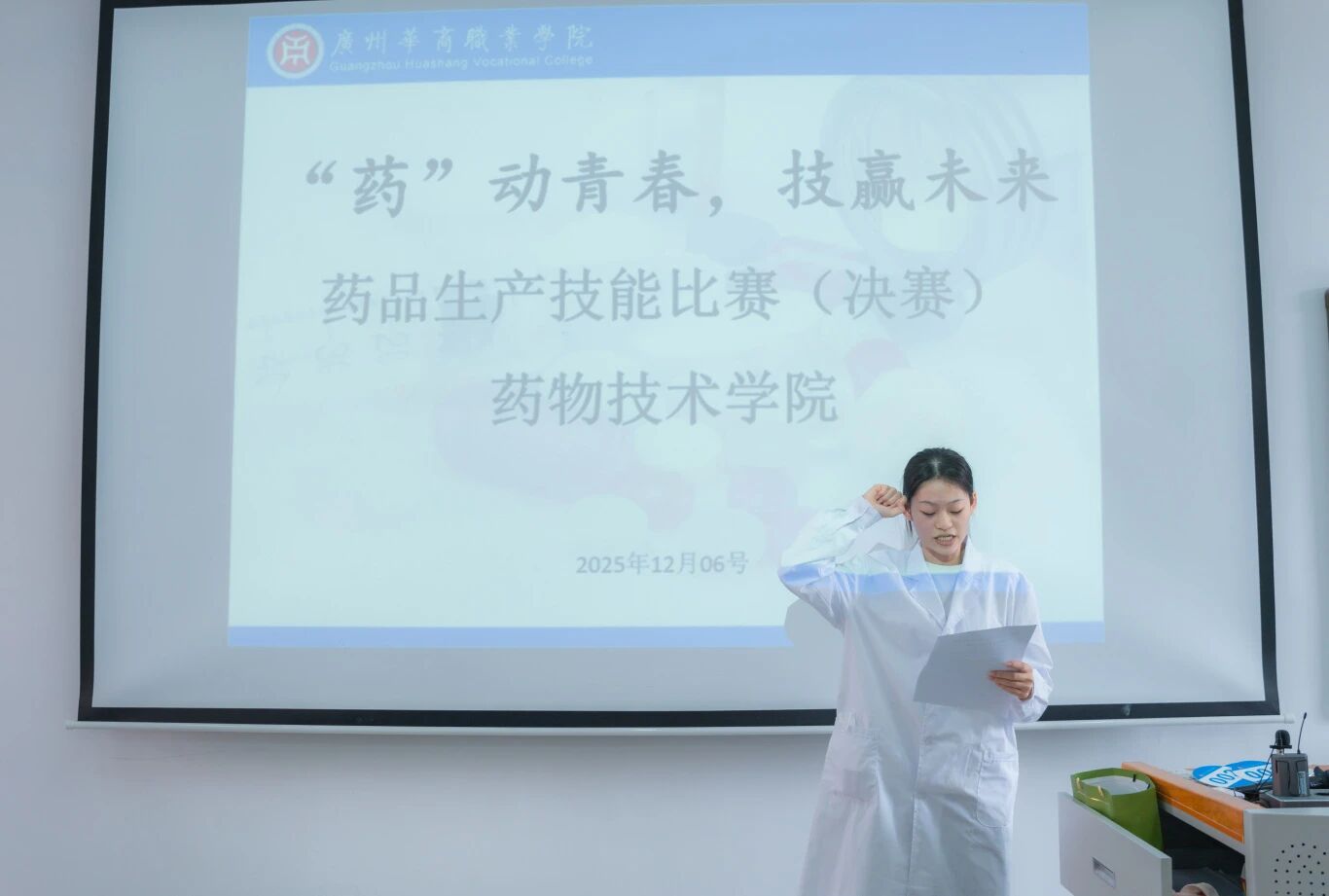 12月6日决赛现场,药物技术学院副院长叶雪兰在开幕致辞中指出,技能大赛是深化教学改革、促进学训结合的重要载体,并鼓励选手展现专业水准与竞技风采,通过实践锤炼技能,筑牢职业发展基础。随后裁判代表潘登老师庄严宣誓,承诺恪守规则、公正裁判;选手代表欧瑷仪同学宣誓严守纪律、全力以赴,彰显华职学子精益求精的工匠精神。
