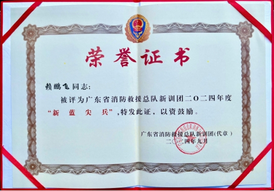经过项目5公里、单杠卷腹10分钟、爬绳、负重两百米、单人组合操法等层层考核。赖鹏飞在500多名士兵中脱颖而出,成为28名尖兵中的一员,他成功考上了新蓝尖兵。现任珠海(国家)高新技术产业开发区消防救援大队消防员。