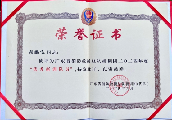2023年9月,他考上广东省消防救援总队消防员,在广东省消防救援总队训练与战勤保障支队进行封闭式训练一年,2024年9月份下队。他曾获2023年新招录消防员入职培训“体能尖兵”;2024年被评为广东省消防救援总队新训团“新蓝尖兵”及“优秀新训队员”等称号。