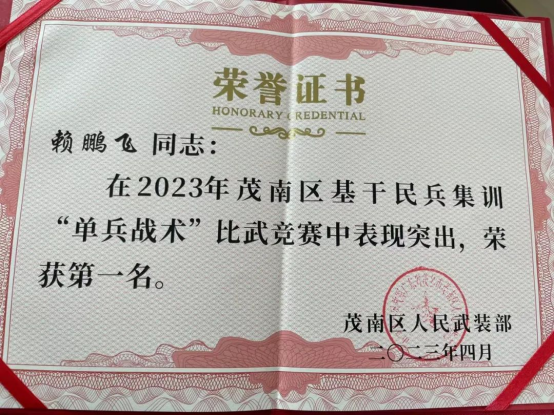 戎装虽褪,军魂不变。集训期间,赖鹏飞获2023年茂南区民兵集训“单兵战术”比武竞赛第一名。2023年茂名市羊角镇曾遭强暴雨,多处内涝,水灾严重。赖鹏飞作为民兵应急救援人员迅速投入防汛救灾工作,安全转移危险区域群众300余人。他在平凡的工作岗位上,始终保持着为党分忧、为国奉献、为民服务的军人本色,坚守在党和人民需要的地方,续写着奋斗篇章。