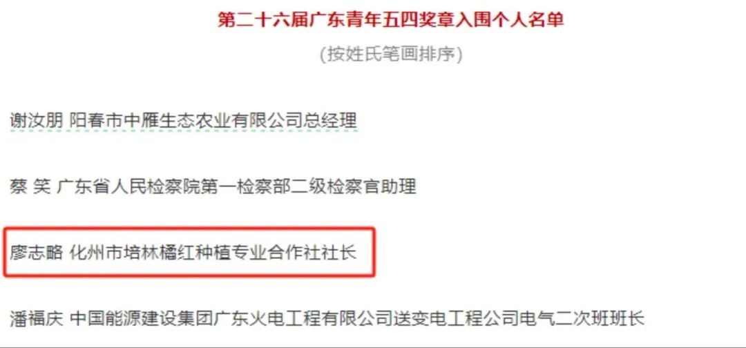 祝贺廖志略入围第二十六届广东青年五四奖章。广东青年五四奖章是共青团广东省委员会、广东省青年联合会授予广东优秀青年的最高荣誉,旨在树立政治进步、品德高尚、贡献突出的广东优秀青年典型,反映当代广东青年的精神品格和价值追求。