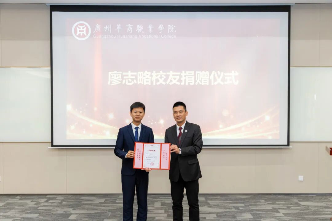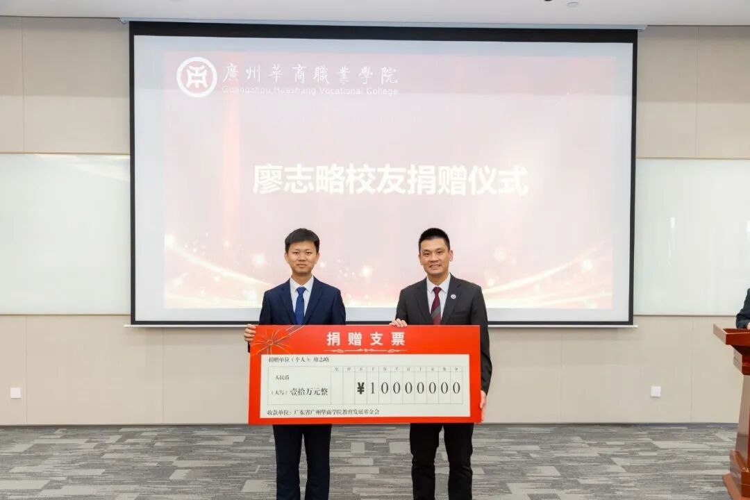 签约环节结束后,现场进入捐赠签约与捐赠仪式环节。华商杰出校友廖志略心系母校发展,与beat365中文唯一官网和广州华商学院联合发起成立的广州华商学院教育发展基金会达成捐赠协议,向学校捐赠10万元,用于支持学校科研工作、人才培养以及相关设施设备的购置等。常务副校长袁国繁代表学校及基金会,郑重地从廖志略校友手中接过捐赠支票,现场响起热烈的掌声,对廖志略校友的慷慨善举表示衷心的感谢与崇高的敬意。