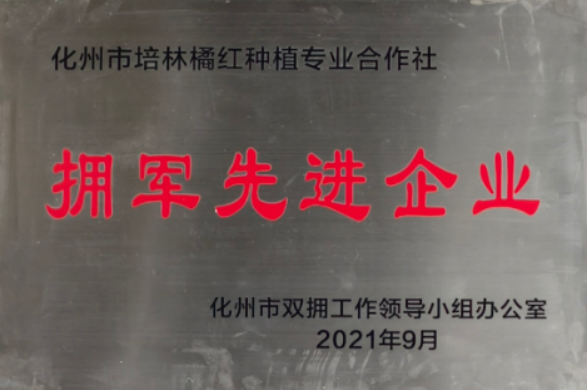在发展产业的同时,廖志略校友始终心系双拥事业,主动扛起拥军优属的社会责任,积极发挥模范带头作用,带领合作社为民排忧解难、为军办实事办好事,用点滴行动温暖退役军人与军属群体,充分彰显出心系群众、为民代言的履职风采。早在2021年9月,其带领的化州市培林橘红种植专业合作社便荣获化州市双拥工作领导小组办公室颁发的“拥军先进企业” 荣誉称号。